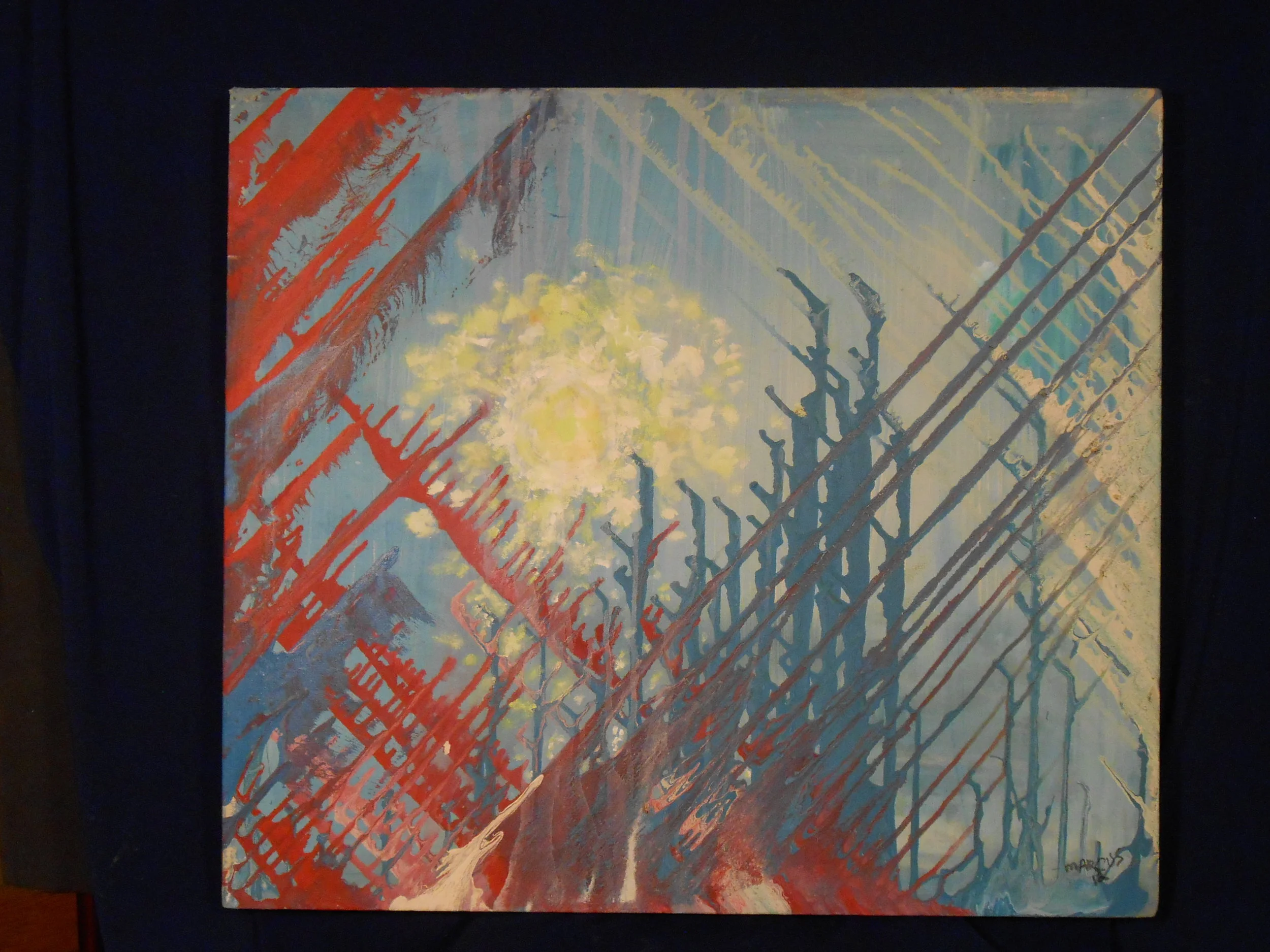 Hand-stretched painters tarp on hand-made frame / not even